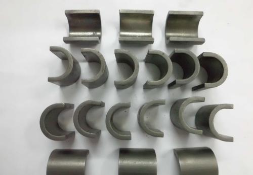 在粉末冶金生產(chǎn)中, 鐵粉的用量比其金屬粉末大得多。 鐵粉的 60% ~ 70% 用于制造粉末冶金零件。主要類型有鐵基材料、鐵鎳合金、鐵銅合金及鐵合 金和鋼。粉末冶金鐵基結(jié)構(gòu)零件具有精度較高,表面粗糙值小,不需或只需 少量切削加工,節(jié)省材料,生產(chǎn)率高,制品多孔,可浸潤滑油,減摩、減振、 消聲等特點。 廣泛用于制造機(jī)械零件, 如機(jī)床上的調(diào)整墊圈、 調(diào)整環(huán)、 端蓋、 滑塊、底座、偏心輪,汽車中的油泵齒輪、活塞環(huán),拖拉機(jī)上的傳動齒輪、 活塞環(huán),以及接頭、隔套、油泵轉(zhuǎn)子、擋套、滾子等。 粉末冶金鐵基結(jié)構(gòu)材料的牌號用“粉”、“鐵”、“構(gòu)”三字的漢語拼 音字首“FTG”,加化合碳含量的萬分?jǐn)?shù)、主加合金元素的符號及其含量的 百分?jǐn)?shù)、輔加合金元素的符號及其含量的百分?jǐn)?shù)和抗拉強(qiáng)度組成。如 FTG60 -20 , 表示化合碳量 0.4% ~ 0.7%, 抗拉強(qiáng)度 200MPa 的粉末冶金鐵基結(jié)構(gòu)材料; FTG60Cu3Mo-40 ,表示化合碳量 0.4% ~ 0.7% ,合金元素含量 Cu2% ~ 4% 、 Mo0. 5% ~ 1.0% ,抗拉強(qiáng)度 400MPa 的粉末冶金鐵基結(jié)構(gòu)材料。